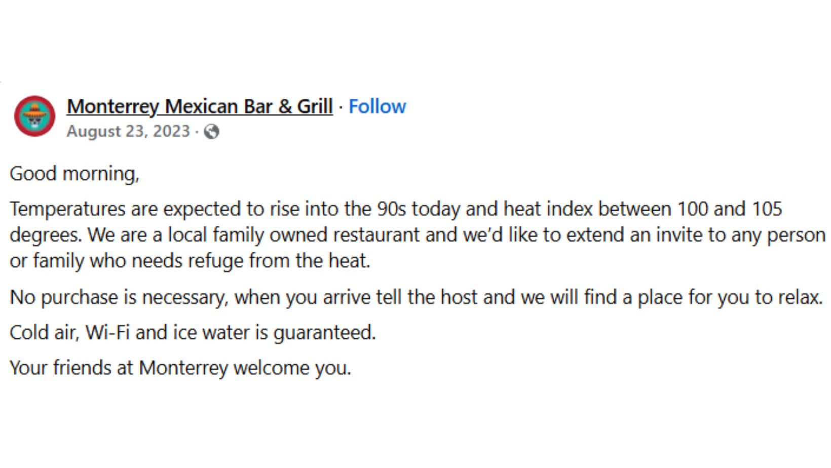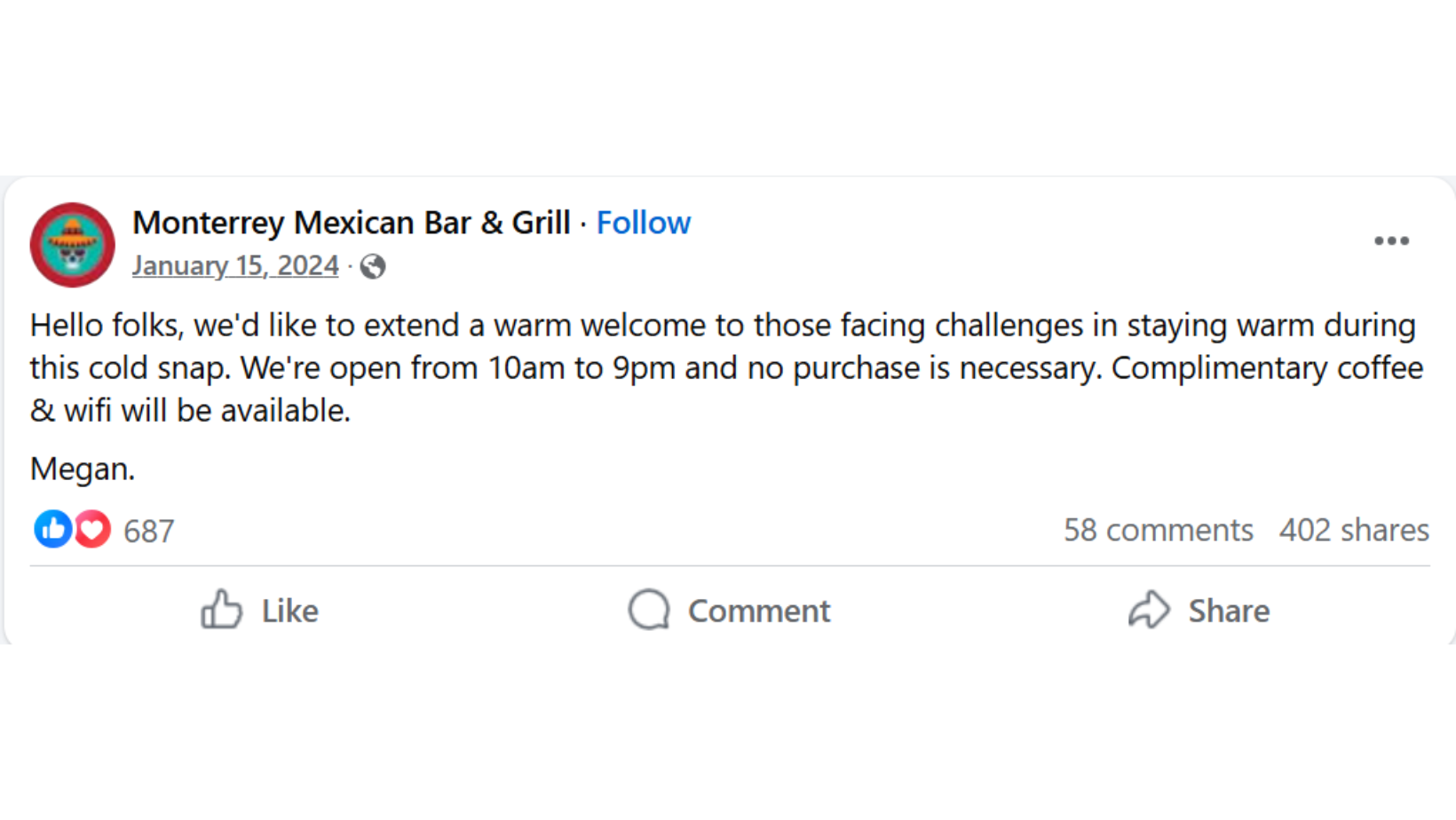 The past several years has brought record breaking highs and lows for Michiana temperature, and several people always voice concern for those who may not have shelter during these times. Megan and her staff at Monterrey Mexican Bar & Grill have taken a step beyond and offered a safe space for those who need it most during those times.
