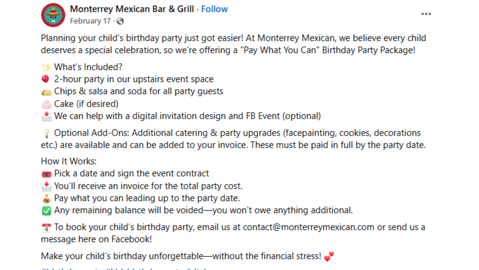 In 2024, a local family was looking for a space to host their child’s birthday party, but soon realized they could not afford one. Megan made a simple quick post, announcing a “pay what you can” rate, offering families in need the space to host their child’s birthday events in their party space upstairs (affectionately called “The Mont”) with complimentary chips, salsa, soft drinks, and a cake that Megan herself will personally cover.